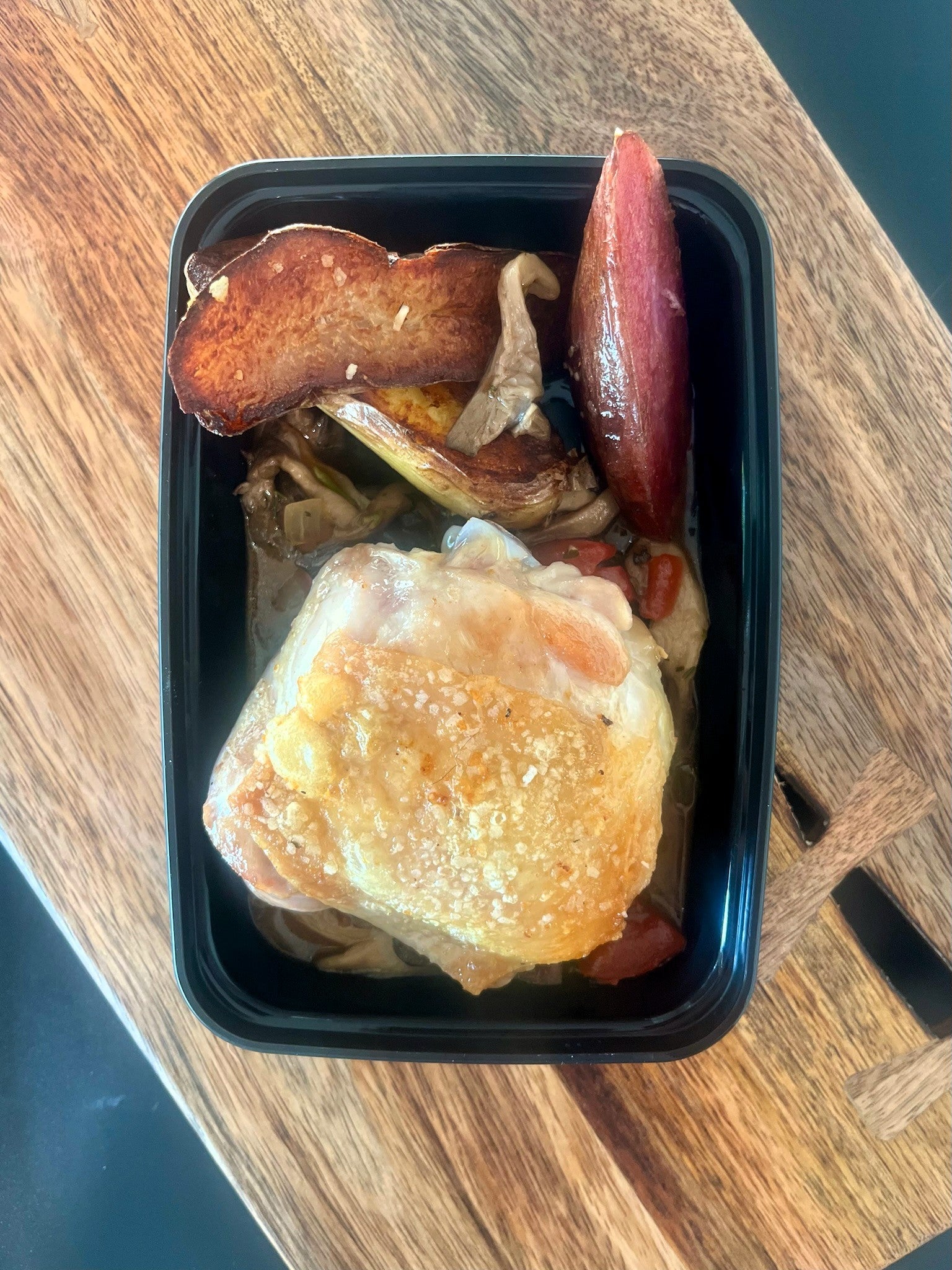 Pan Fried Chicken Thigh, Mushrooms, Tomatoes & Roasted Fingerlings